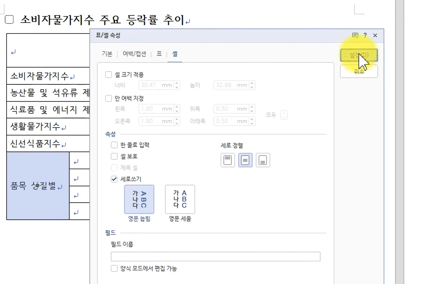 표/셀 속성 → 셀 탭으로 이동합니다.