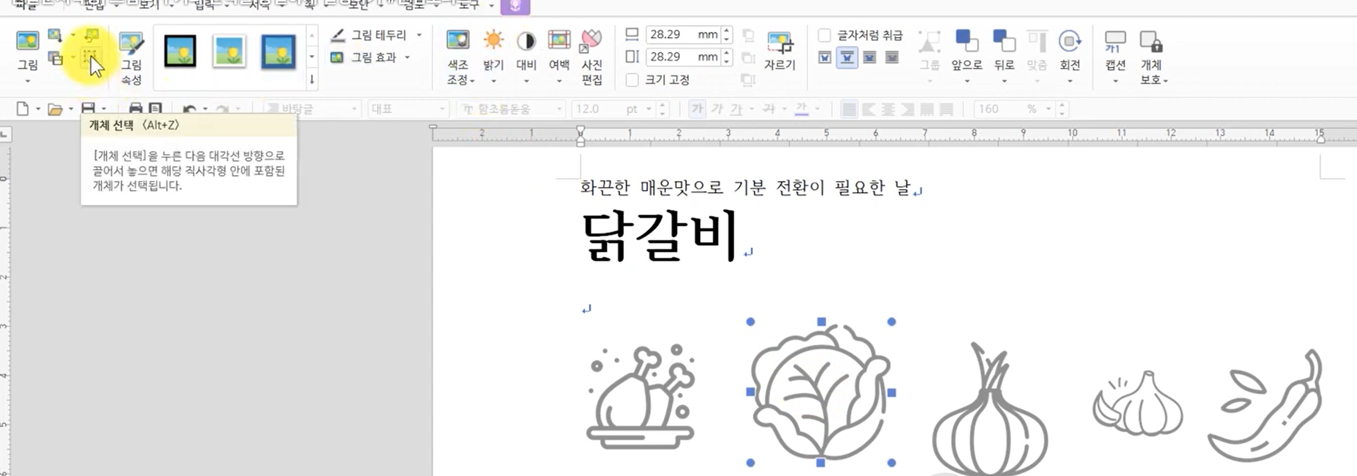 대각선 방향으로 드래그하면 해당 영역의 그림·도형이 동시에 선택됩니다.