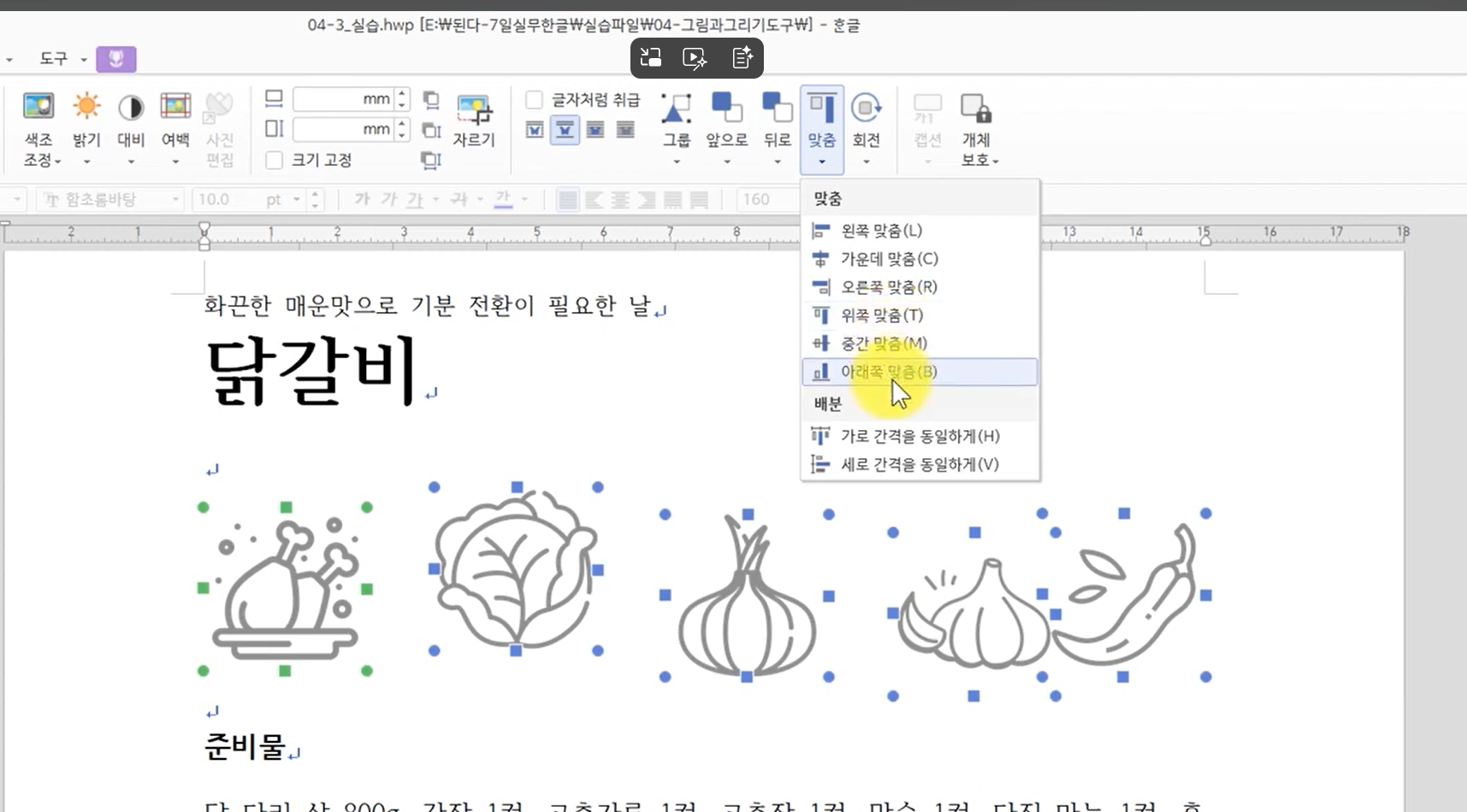 선택한 여러 그림을 하나의 기준선에 맞춰 자동 정렬하는 기능입니다.