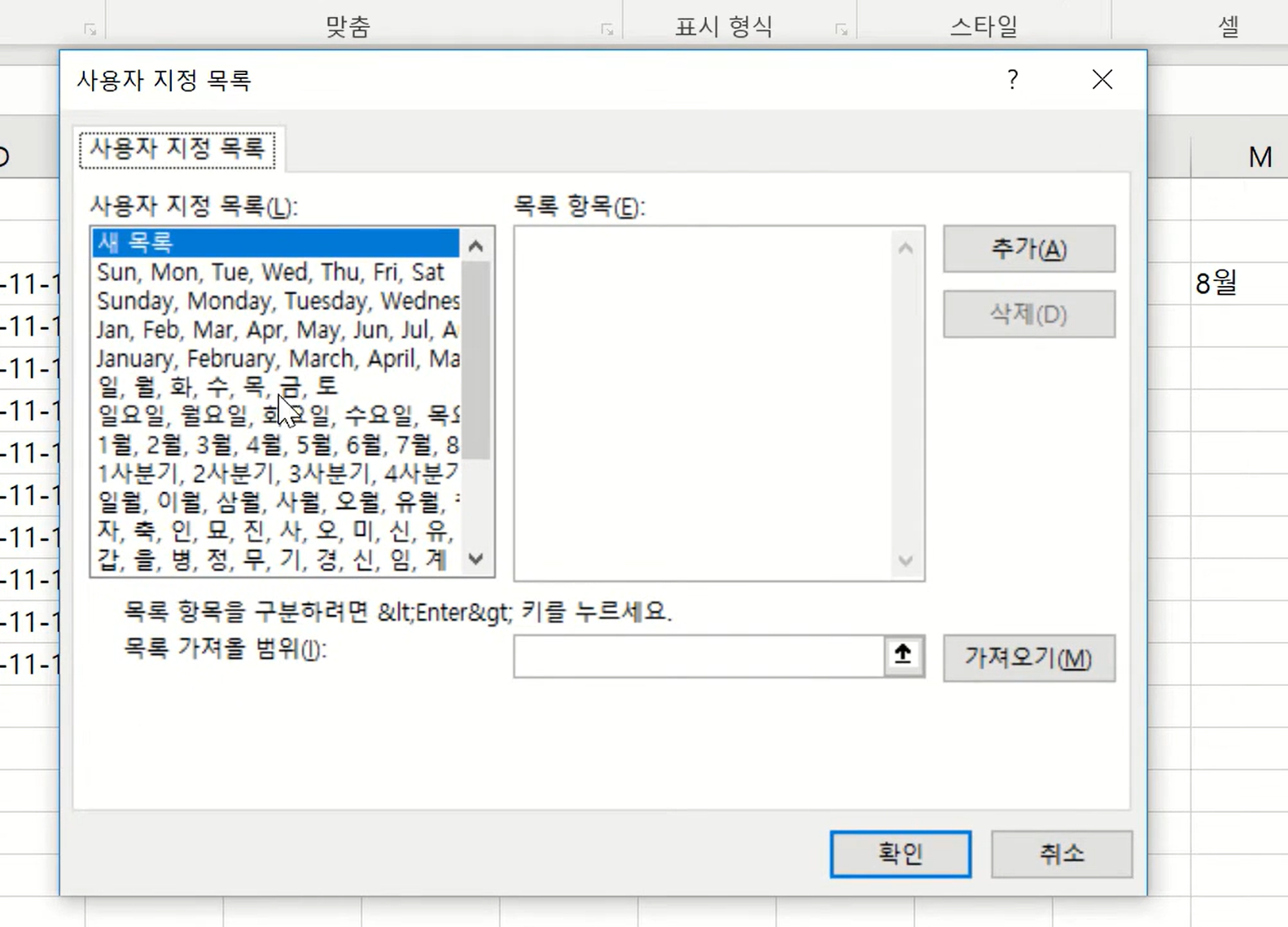 엑셀이 기본으로 제공하는 목록들이 이미 들어 있습니다.