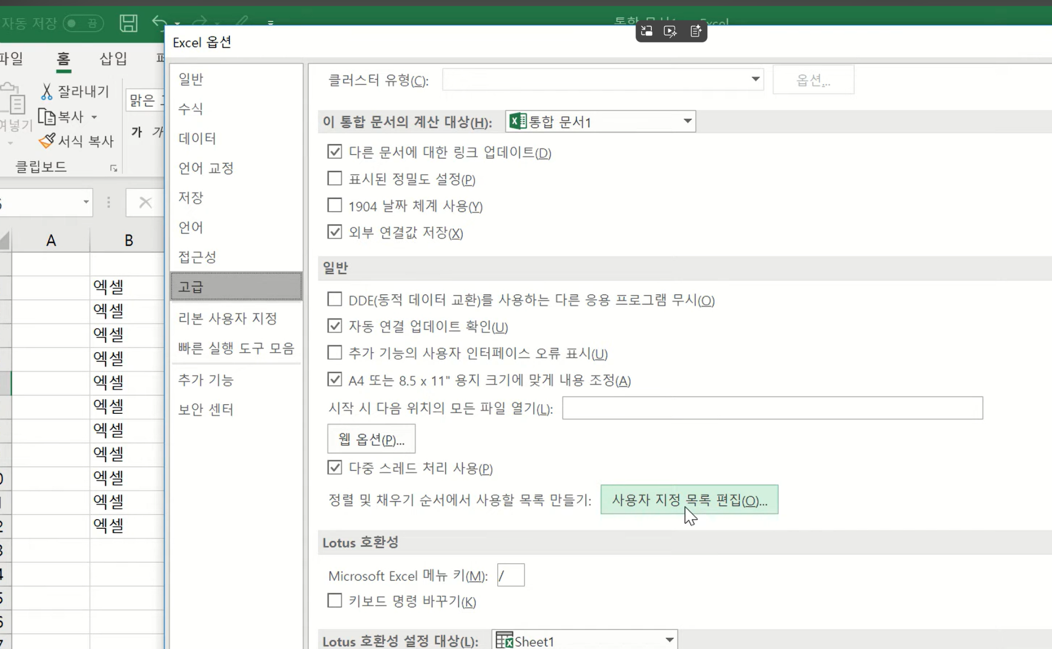 파일 → 옵션 → 고급 → 사용자 지정 목록 편집