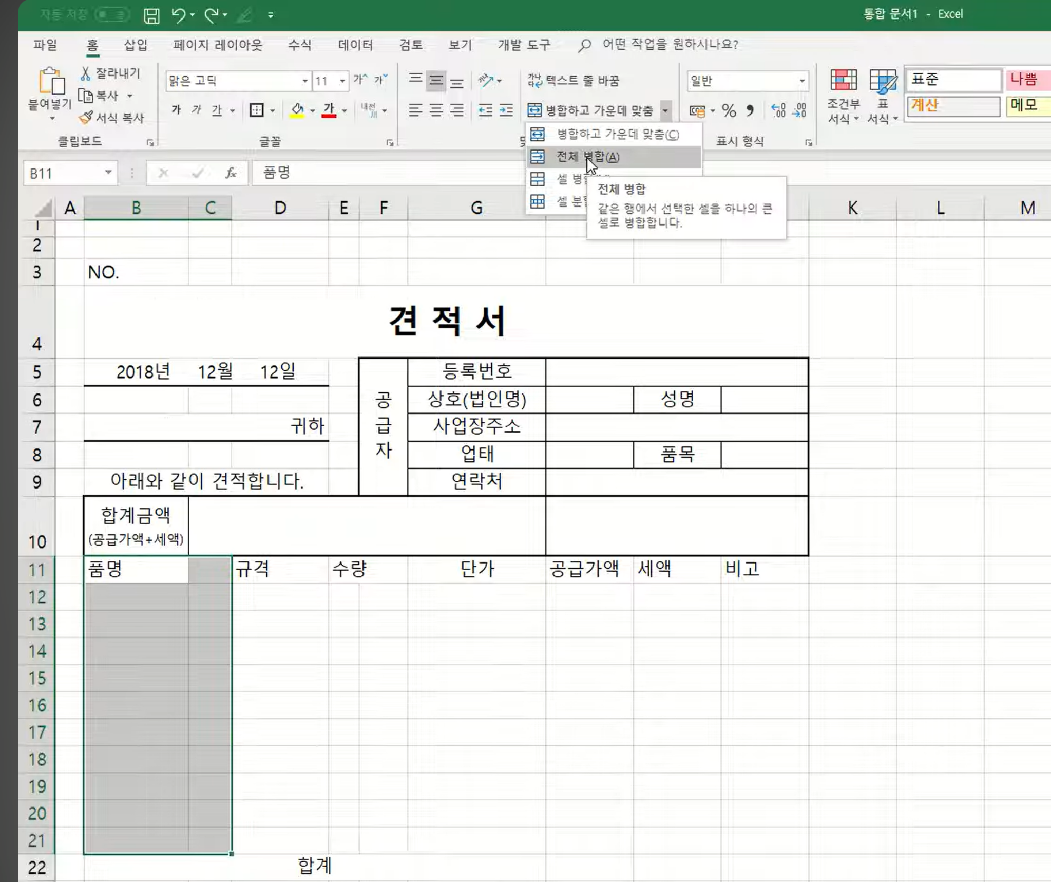병합하고 가운데 맞춤과 전체 병합을 헷갈리기 쉽습니다.