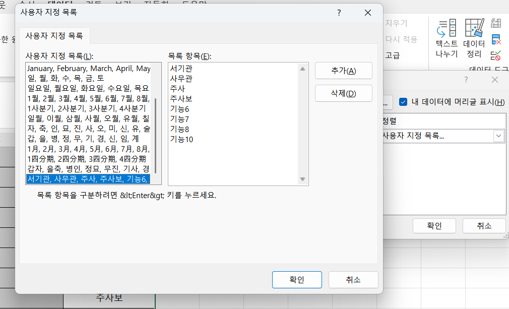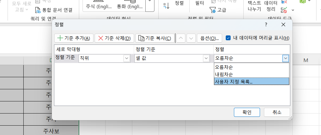 - 데이터 → 정렬 → 사용자 지정 목록을 선택합니다.
