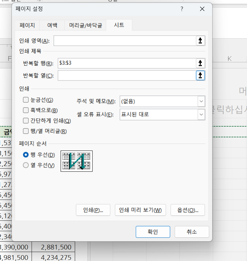 페이지 레이아웃의 ‘인쇄 제목’ 설정입니다.