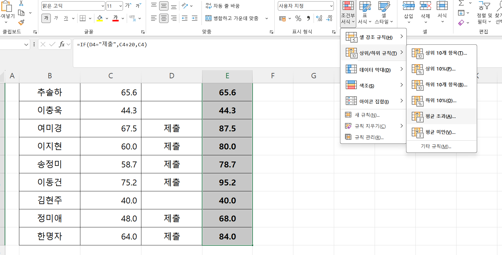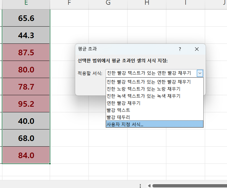 엑셀에서 점수나 수치 중 평균 이상인 값만 강조하고 싶을 때 가장 많이 쓰는 기능이
