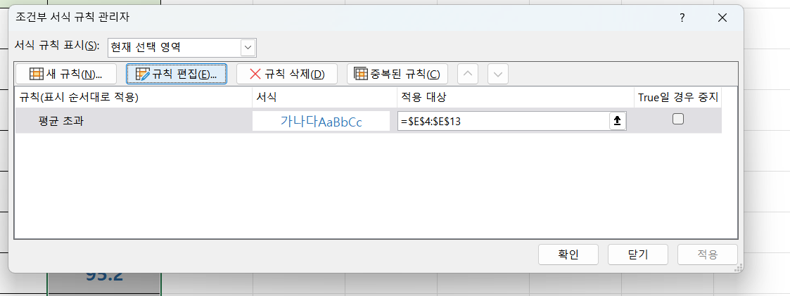 조건부 서식 → 규칙 관리 → 규칙 편집으로 들어갑니다.