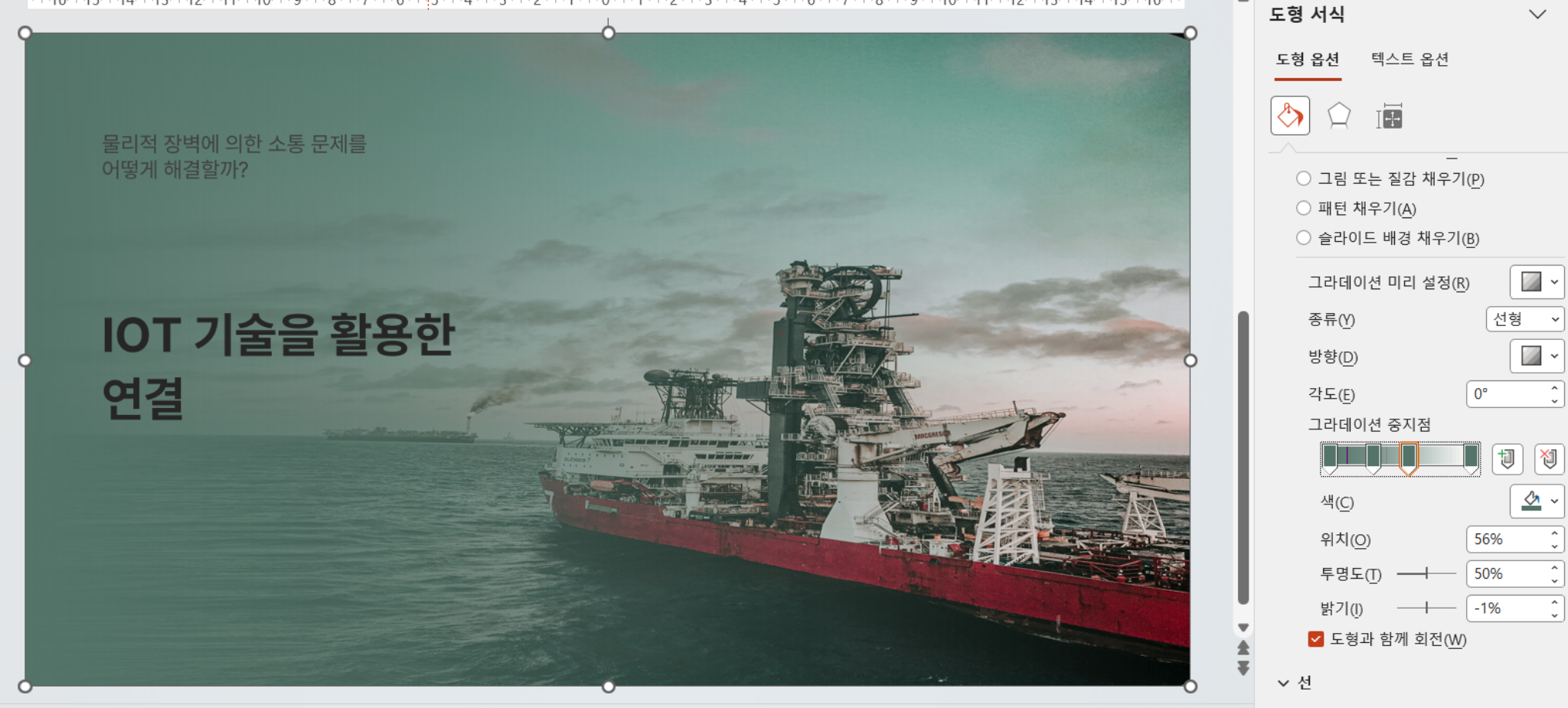 이미지 위에 도형을 하나 올린 뒤, 그라데이션 채우기를 선택합니다.
