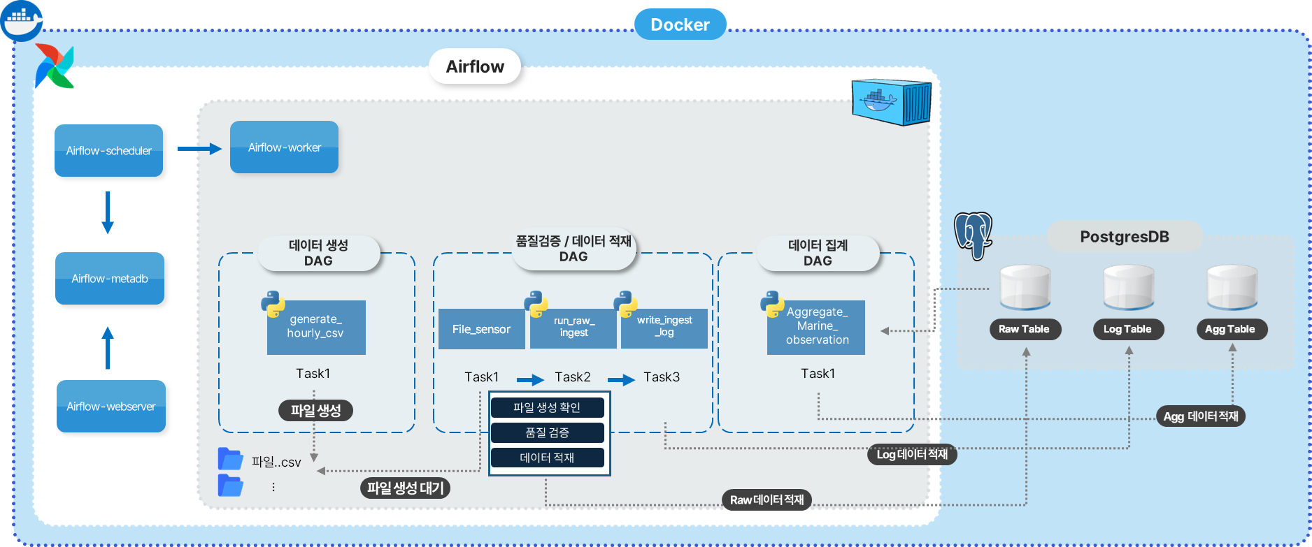 해양 센서 데이터를 시간 단위로 생성 → Raw 적재 시 품질 검증 → 일 단위 집계로 처리한 ETL 파이프라인 설계를 정리합니다.