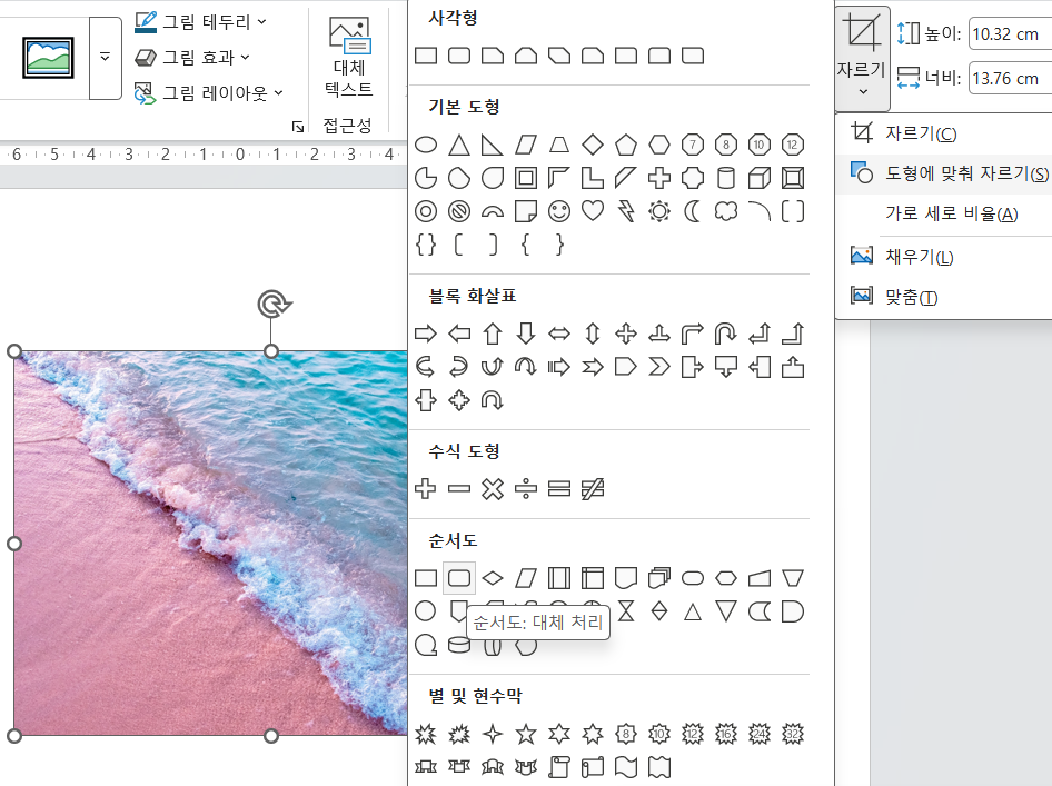- 선택한 도형 모양 그대로 이미지가 잘리는 기능입니다.