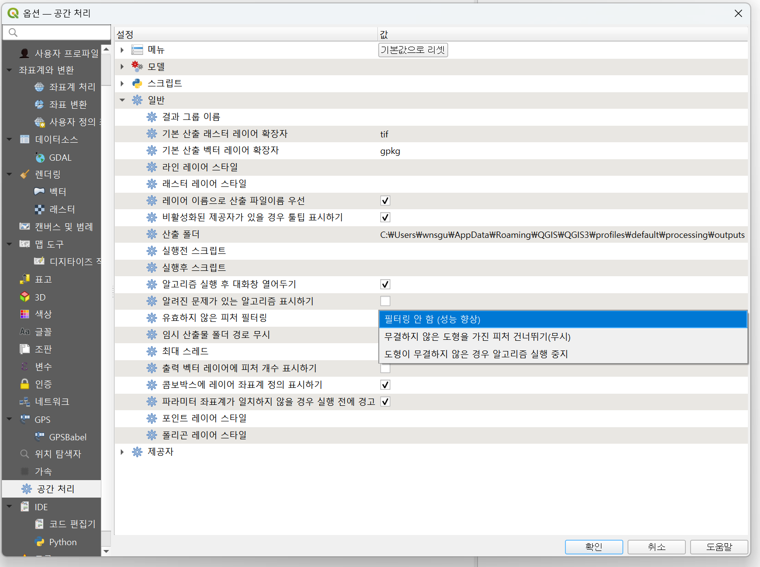 QGIS에서는 설정 > 옵션 > 공간처리 메뉴에서 유효하지 않은 객체를 포함·건너뛰기·중단 중 선택하여 처리 방식을 제어할 수 있습니다.
