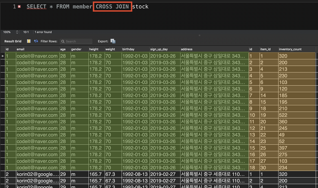 예를 들어, 상의 테이블과 하의 테이블을 CROSS JOIN 하면 가능한 모든 코디 조합을 얻을 수 있습니다.