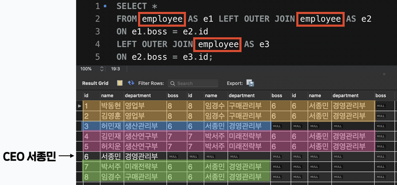 - 조직도 조회: employee 테이블에서 boss_id를 자기 자신의 id와 조인해 상사 정보 붙이기