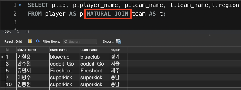 - 특징: 두 테이블에서 이름이 같은 컬럼을 자동으로 찾아 조인 조건으로 삼습니다.