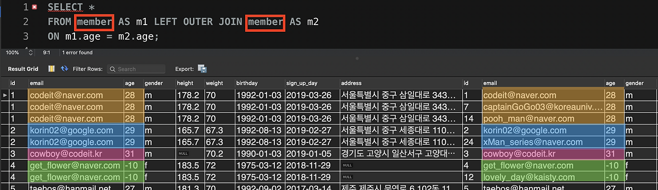 - 특징: 같은 테이블을 두 번 불러와 서로 다른 alias를 붙여 조인.