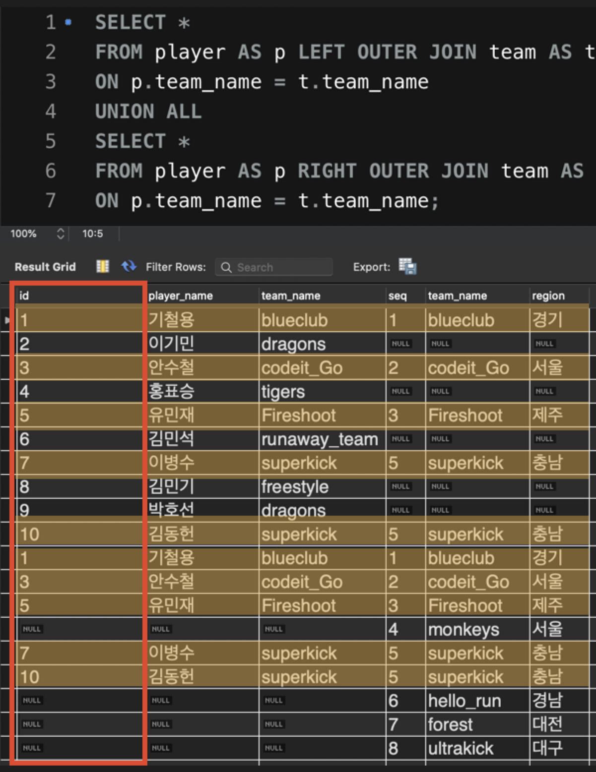 - FULL OUTER JOIN: LEFT + RIGHT 결과 합침
