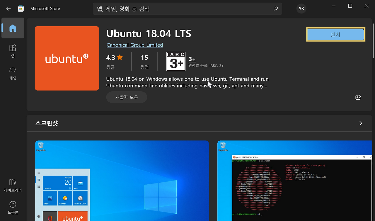 - Microsoft Store에서 Ubuntu 18.04 LTS 설치