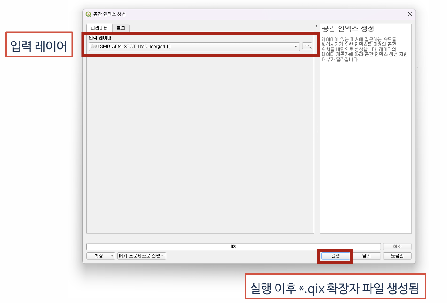 - “실행”을 누르면 QGIS가 해당 레이어에 대해 인덱싱을 수행합니다.