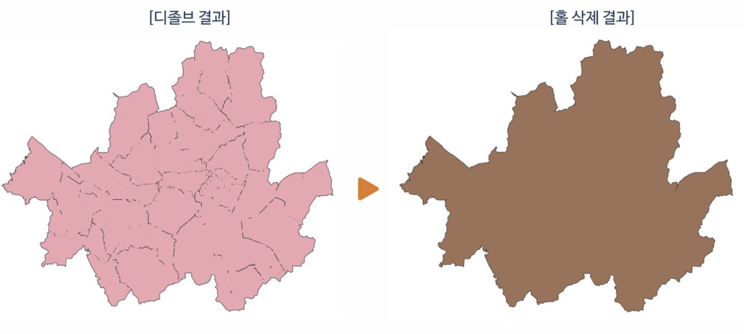 디졸브 + 홀 삭제는 지도 제작이나 분석을 위한 기본 전처리 과정으로 활용되며,