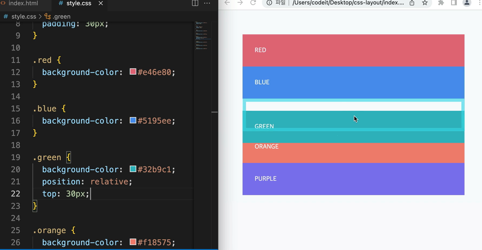 이번엔 position: relative를 사용한 예제입니다.