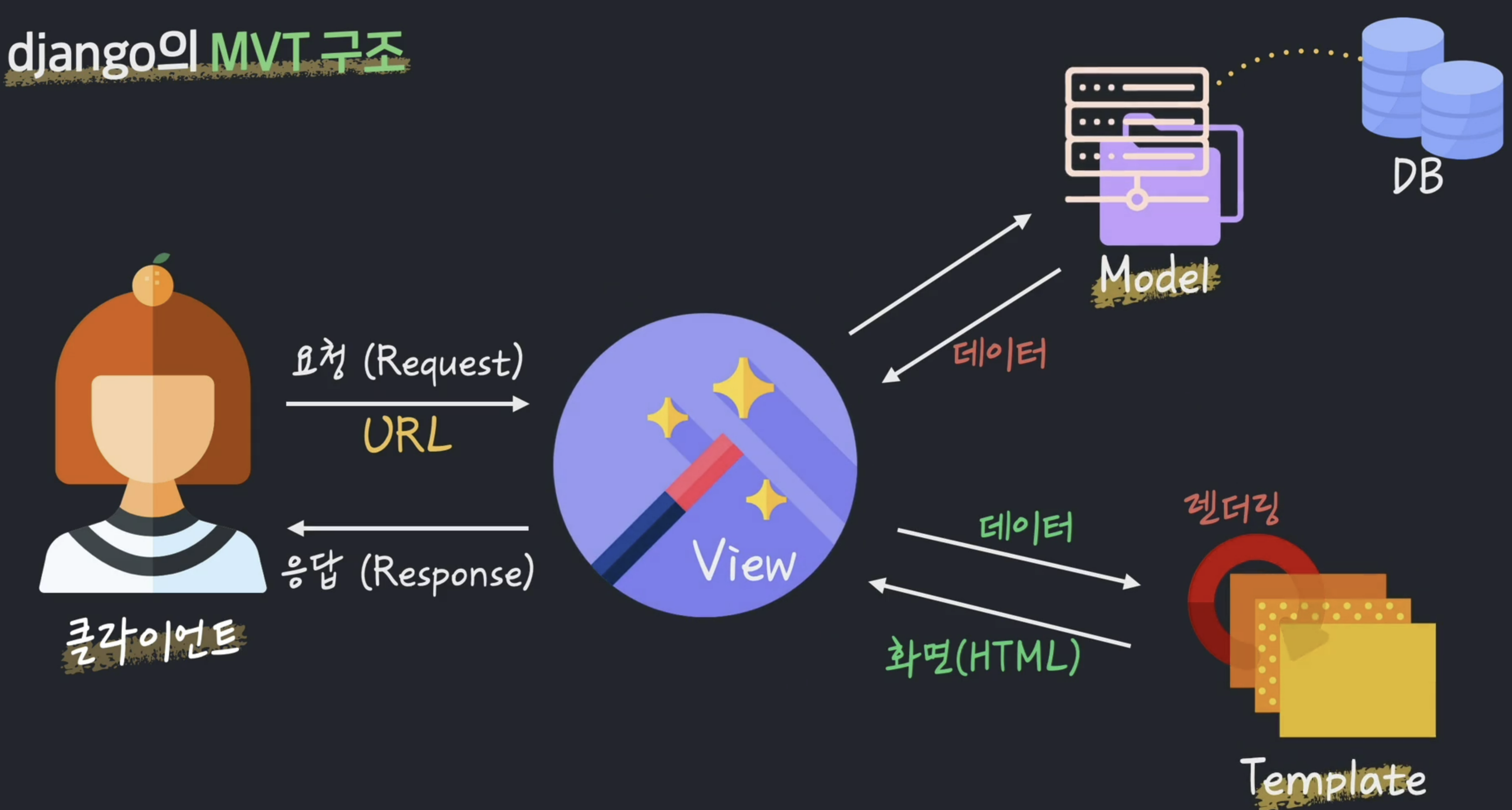 Django는 MVT(Model–View–Template) 구조를 기반으로 웹 애플리케이션을 구성합니다.