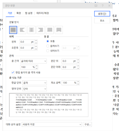 한글 문단 모양 설정은